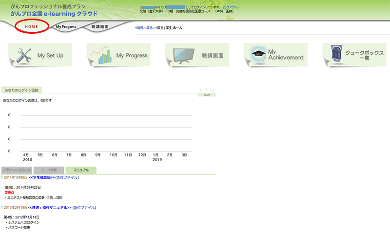 HOME画面ではがんプロ全国e-learningクラウドに登録されている全講義(医師、看護師、医学物理士向けなど)を受講することが出来ます(予め、My Set Upにて、受講する科目を選択する必要があります)。