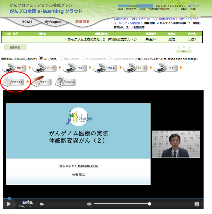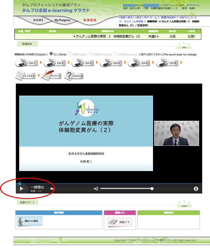 e-learning講義を受講する場合は聴講画面をクリックし、表示された科目名をクリックすると、北信がんプロ連携大学が作成した講義(金沢大、富山大、福井大、金沢医科大、石川看護大、信州大または北信1、北信2)にe-learning講義が水色のボタンで表示されます。