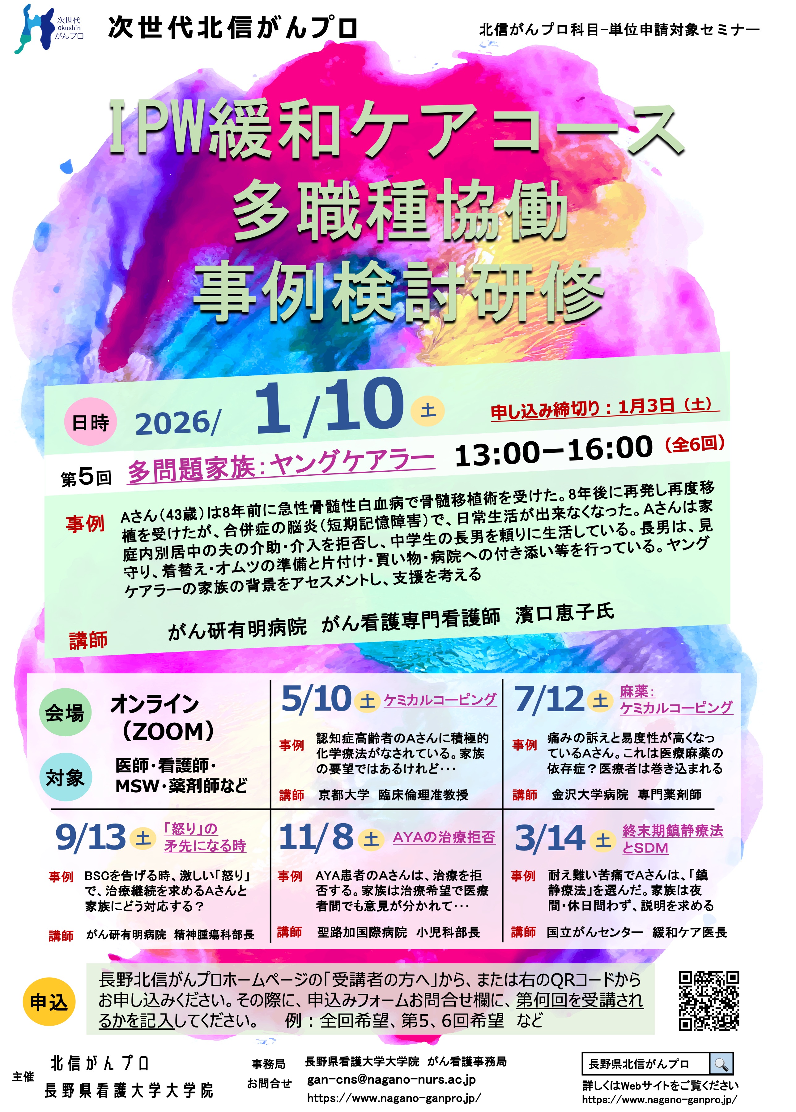 1月10日(土)IPW緩和ケアコース:第5回「多問題家族:ヤングケアラー」の事例検討を行います 1月10日(土)IPW緩和ケアコース:第5回「多問題家族:ヤングケアラー」の事例検討を行います 受講を希望される方は、トップページ「受講者の方へ」の「受講者申込み」よりお申し込みください。 希望される回を備考欄にご記入ください。(例:第5回希望 第5、6回希望 等) 残り全回の受講をご希望の方は、備考欄に「全回希望」とご記入ください。 申し込み締め切り日は、1月3日(土)になります。