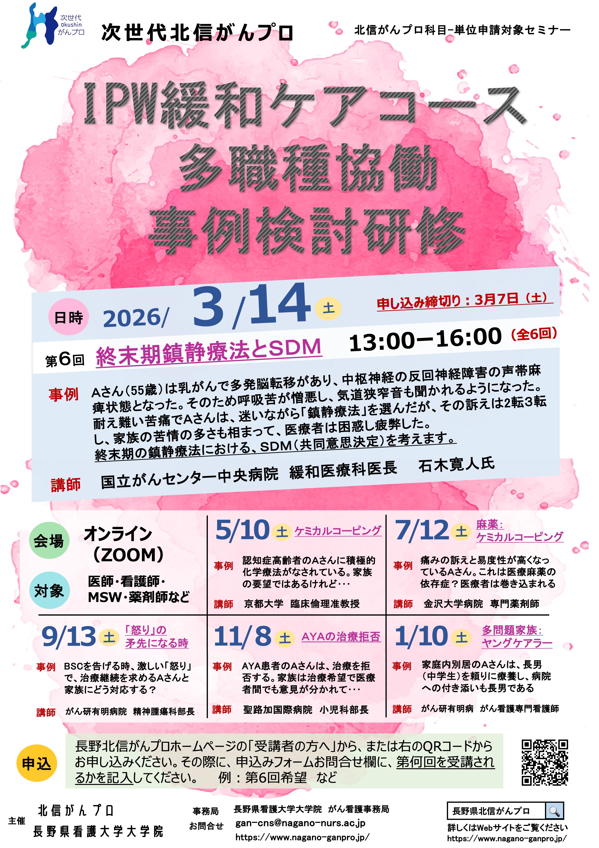 3月14日(土)IPW緩和ケアコース:第6回「終末期鎮静療法とSDM」の事例検討を行います 3月14日(土)IPW緩和ケアコース:第6回「終末期鎮静療法とSDM」の事例検討を行います。 受講を希望される方は、トップページ「受講者の方へ」の「受講者申込み」よりお申し込みください。 希望される回を備考欄にご記入ください。(例:第6回希望) 申し込み締め切り日は、3月7日(土)になります。
