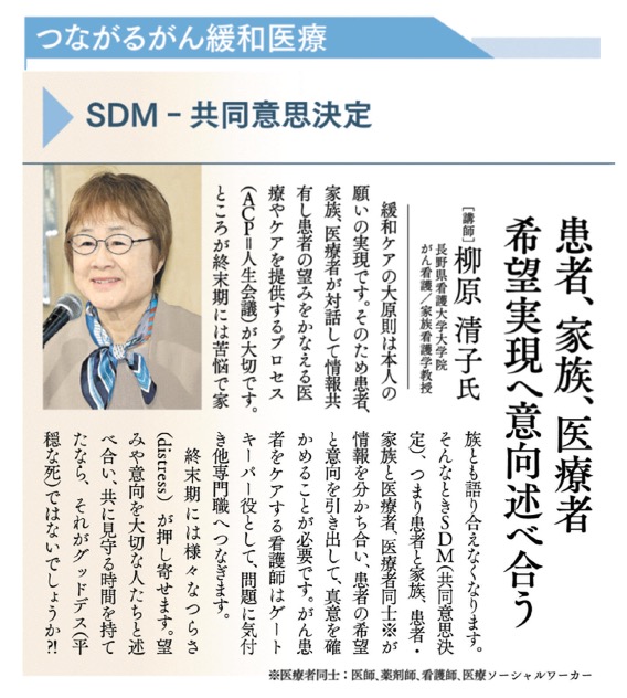 第3回 北信がんプロ合同市民公開講座が新聞で紹介されました 市民公開講座で講演した、がん看護の「SDM-共同意思決定:希望と意向を述べ合う時」が、北国新聞で特集として掲載されました。 この講演では市民に向け、『がんの看護(師)とは、患者・家族の願いを実現させるためにゲートキーパー役を果たすこと』を強調しました。